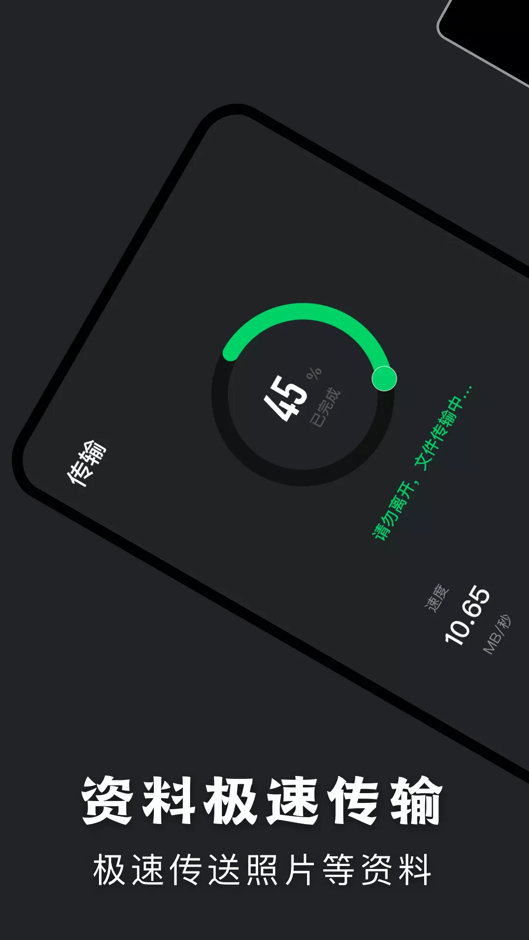应用介绍 一款极速手机互传克隆换机工具 功能特点: 无线连接:无需连接电脑,手机与手机之间就能直接传输 零消耗:手机直连快传技术,互传资源不费任何手机流量 不限机型:新旧手机上直接安装即可使用,不受品牌及系统版本影响,换机更轻松 安全可靠:仅限双机面对面之间互联传输,全面保护您的隐私 简单便捷:无论是您的通讯录联系人、照片还是视频,都可以一键传输,操作更加简单方便